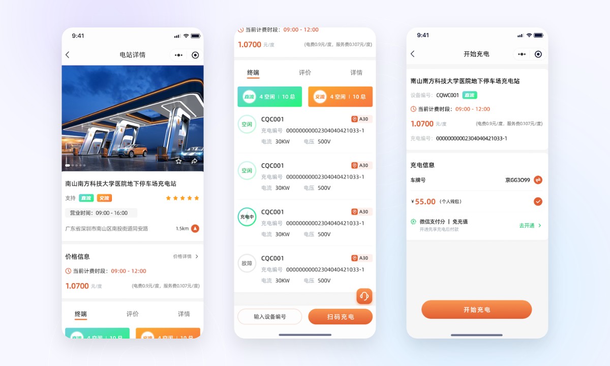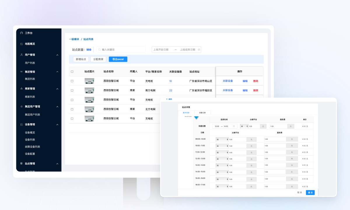 支持新增站点,可将归属商家的站点分配至对应商家账户。可查看并编辑站点基本信息及相关设备资料,同时设置不同时间段的充电费率与服务费标准。