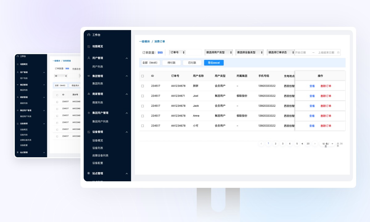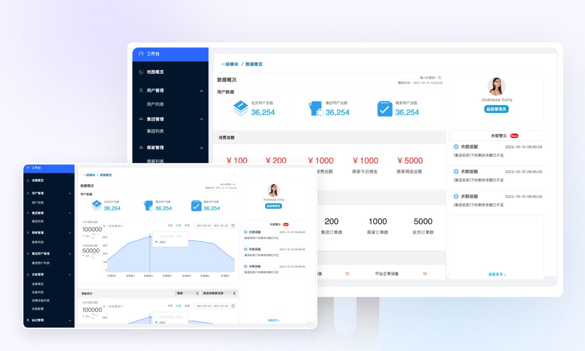 支持不同角色用户查看相应数据看板。平台方可查看多维度数据,涵盖用户分类统计、全部订单信息、设备运行状态、充值记录及佣金明细等。