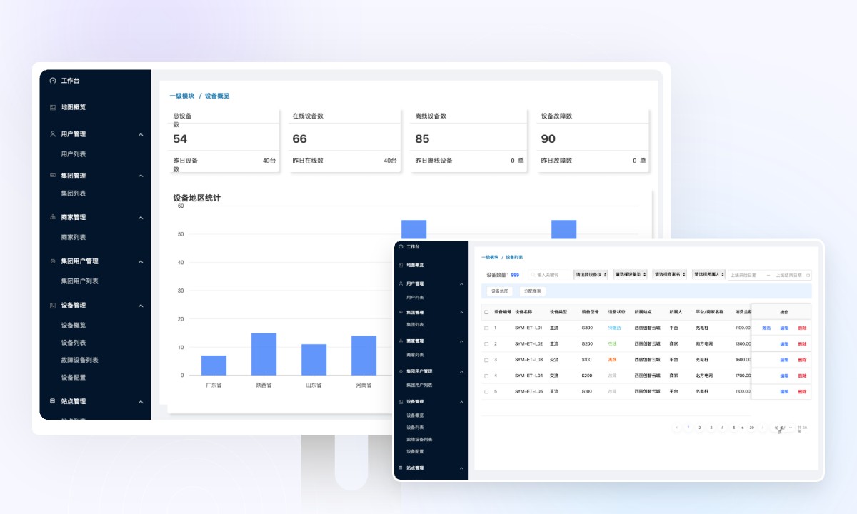 提供平台设备整体概览及详细管理功能,支持设备的新增、激活、停用、删除、绑定电站及商家等操作,并可查看故障设备列表及其详情,便于及时处理问题。