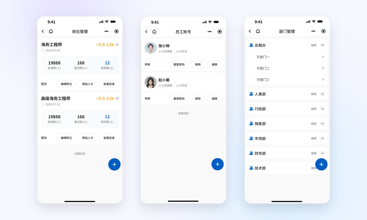 涵盖企业端的部门设置、员工账号管理、岗位维护等内容,有助于合理分配内部人员的工作任务并设置相应权限。
