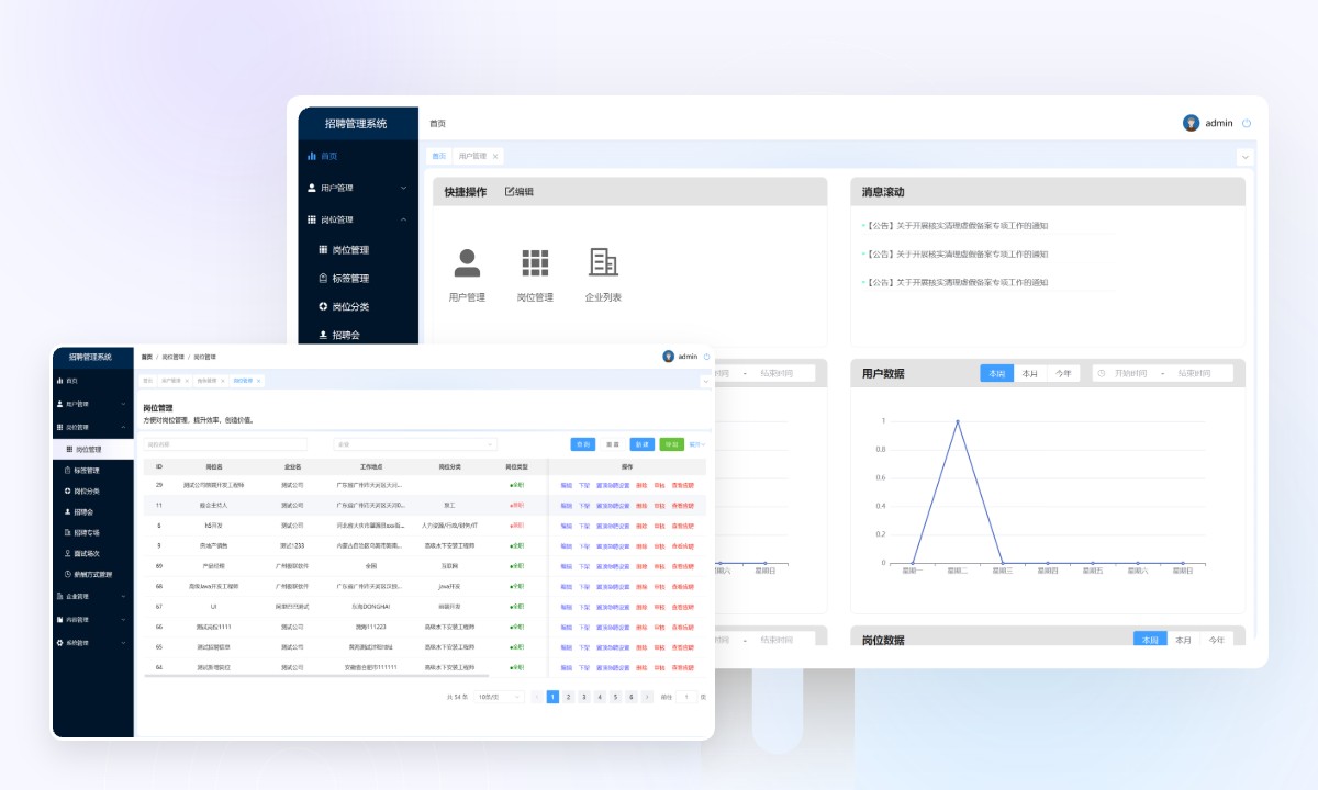 作为南油服务的运营管理平台,核心功能包括用户管理、简历管理、企业管理及岗位管理等,同时支持数据统计与导出操作。