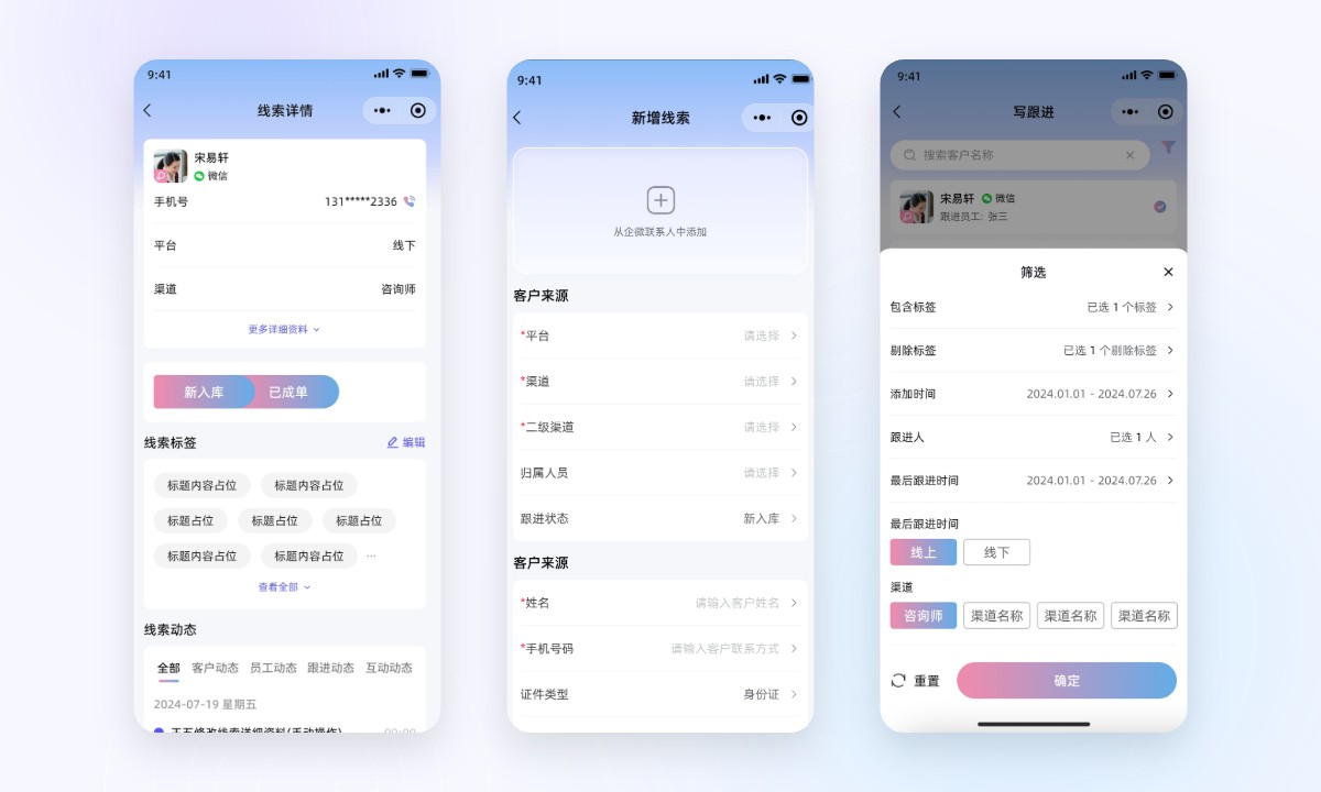 客户信息管理公司客服人员管理客户线索,分配线索到商务人员进行线索转化,填写客户跟进记录,系统可实时查看客户基本信息、交易记录、医疗记录、沟通历史等。