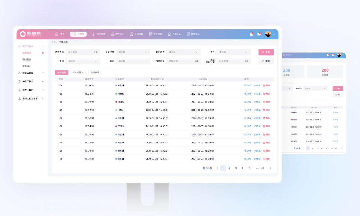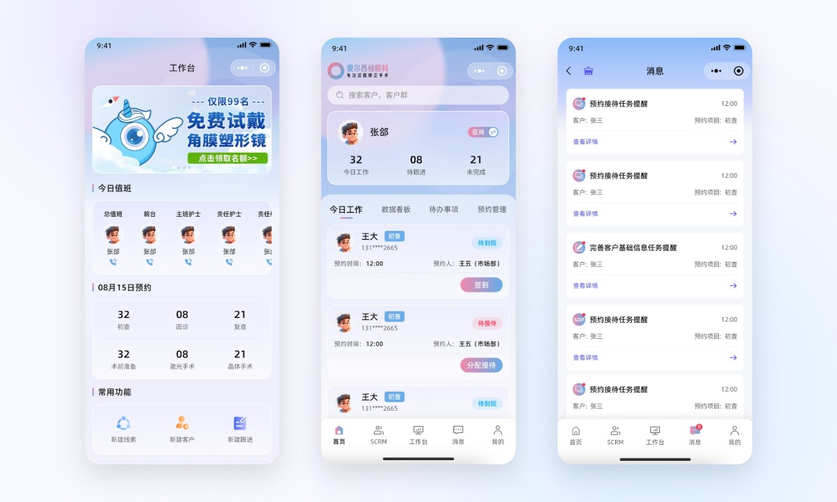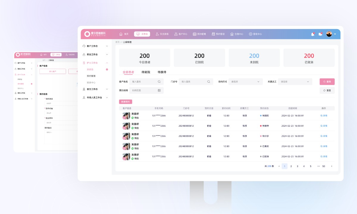 工作台管理系统支持不同同岗位人员查看自身的工作任务,医生查看自己的手术预约、商务人员查看自身的客户跟进,客服查看客户的预约。