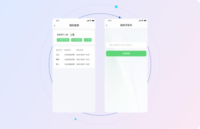 展示当前账户的用户总人数和授权账号信息,如授权人、授权账号、授权日期。