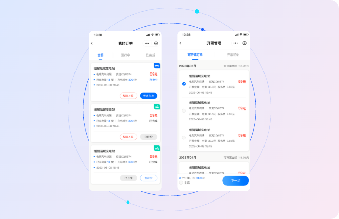 开票管理:开票管理支持充电订单发票申请,可查看开票记录,便捷管理票据